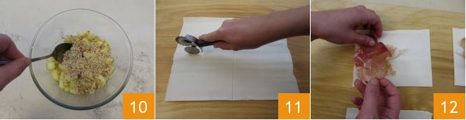 Mix the ingredients well to combine them 10 and set aside. Then focus on the pastry: take it and use a pastry cutter to cut each rectangular sheet of pastry into four squares of 6 inches per side 11. Space out the pastry squares and place slices of culatello in the center of each piece 12.
