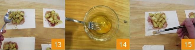On top of it, add apple chunks 13, being careful not to add too much apple liquid because it could make the pastry too wet, causing the liquid to seep out during baking. Repeat the steps for the other 7 pastries, until the ingredients are used up. Then take an egg and beat it with a fork 14: brush it on the edges of the pastry to help seal the pastry 15.