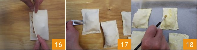 Fold the pastries in half 16 and align all the edges. Seal them with the tines of a fork 17 to prevent the filling from leaking during cooking. At this point, the pastries are ready: place them on a baking sheet lined with parchment paper and brush the surface with the remaining beaten egg 18. Finally, bake in a preheated static oven at 428°F for about 12 minutes (if using a convection oven, 392°F for about 8 minutes: we suggest testing the cooking of one pastry to better gauge the others).