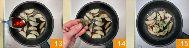 In a pan, melt some butter, add the apple slices 10 and season with salt 11 and pepper. Sauté over medium heat for 3 minutes. Add the honey 12.