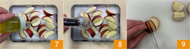 Place them on a baking tray lined with parchment paper and season with oil 7, salt, and pepper 8. Bake in a fan oven, preheated to 392°F (200°C) for 15 minutes. Separately, cut an apple into slices 1/12 inch (2 mm) thick 9.