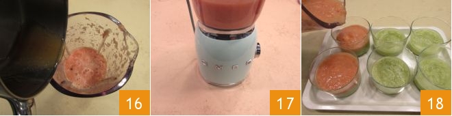 and blend until you get a puree on which you will pour the now cold syrup 16. Let the blades run a little longer to have a homogeneous mixture 17. Take the glasses from the fridge and also pour the grapefruit puree (2.8 oz for each glass) onto the now set bases 18.