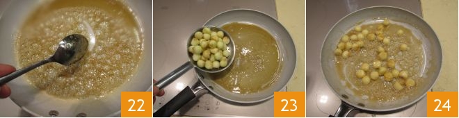 When the mixture becomes viscous enough (you can test it with a spoon) 22 lower the heat, drain the apple pulp balls from the acidulated water and pour them into the pan 23, letting them caramelize for a minute 34.