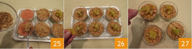 Crumble the amaretti by hand, then take the glasses and sprinkle them with the crumbled amaretti 25, then arrange the caramelized apple balls and garnish the glasses with the grated grapefruit zest you had stored in the fridge 26. Your apple and grapefruit glasses are ready to be served but if you want, you can garnish them with some green apple zest cut into strips 27.