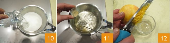 In the meantime, focus on the grapefruit puree, so prepare the syrup again by pouring water and granulated sugar into a small pot 10; let it dissolve, then turn off the heat and add the agar-agar, stirring to prevent lumps 11; let it cool. Grate the zest of ¼ of a grapefruit, collecting it in a container and storing it in the fridge for the final decoration 12.