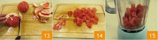 To peel and segment the grapefruit: simply peel it, removing the white part as well 13; from the obtained pulp you can finally remove the waste and instead keep the wedges to cut into 2 or 3 parts 14. Pour the cubes into the blender 15
