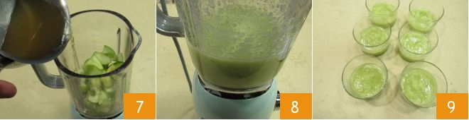 In the meantime, wash and dry the apples, cut them in half, and remove the core 4. With a melon baller, make small balls of pulp 5 and drop them into acidulated water (to make it, just squeeze a lemon into a container with cold water) to prevent them from turning brown. In another container, collect what is left from the apples and pour it into the blender 6,
