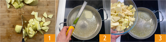 To prepare the apple puff pastry squares, first clean the apples. Core them and cut them into fairly thin slices 1. In a pot, melt the butter, then add the lime zest 2 and the apples 3.