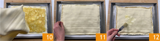 Place a second puff pastry sheet on top 10 and seal the edges well 11. Brush with melted butter 12.