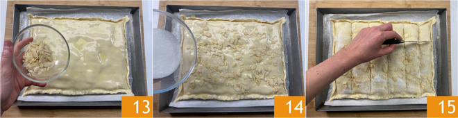 Sprinkle the surface first with sliced almonds 13 and then with sugar 14. Using a knife, apply pressure to score the top layer of the pastry and the filling, but not the bottom layer, creating lines on the surface: 4 on the short side and 6 on the long side 15. This way, you'll form the squares.