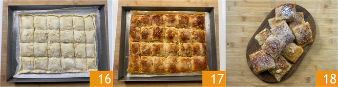 Once this is done 16, bake in a static oven at 350°F for 35-40 minutes 17. For perfect browning, check during the final minutes that the sugar has caramelized; if not, place the baking sheet on the top rack and continue baking for a few more minutes. Remove from the oven and let cool slightly. Separate the squares with your hands or a knife, and dust with powdered sugar. Your apple puff pastry squares are ready to be enjoyed 18.