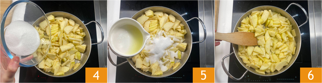 Add the sugar 4, lime juice 5, and stir 6. Cook over medium-low heat, stirring frequently, for 10 minutes. A syrup should form that will thicken and caramelize over time, while the apples will break down into a compote-like consistency. Once ready, let it cool completely.