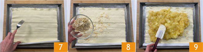 On a baking sheet covered with parchment paper, lay out the puff pastry and prick it with a fork 7. Spread the sliced almonds 8 on the surface to enrich the filling and partially protect the pastry from the moisture of the filling. Pour the apple compote 9 and spread it over the surface, leaving 3/4 inch from the edges.