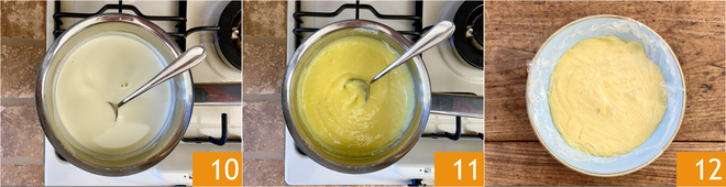 Pour the mixture into a non-stick saucepan and stir with a spoon while cooking over low heat 10. Let the custard cook, stirring constantly, until it thickens 11. This will take a few minutes. Transfer the cream to a bowl, cover with cling film in contact, and let it cool 12.