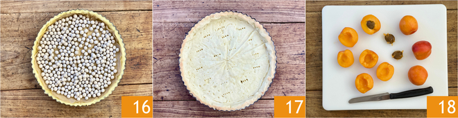 Then cover the shortcrust pastry with a sheet of baking paper and pour dried beans or ceramic baking weights over it 16. Bake the shortcrust pastry in a preheated static oven at 355°F (180°C) on the middle rack for about 15 minutes. Remove from the oven, remove the baking paper with the dried beans 17, and let it cool. Wash and dry the apricots well. Cut them in half and remove the stone 18.