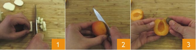 To prepare the apricots in puff pastry, first cut the scamorza into small cubes 1, then wash and carefully dry the apricots, cut them in half 2, and remove the pit 3.
