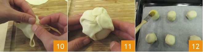 on all sides 10 and press the pastry slightly to seal it 11. Now place the apricots on a baking sheet lined with parchment paper and brush the surface with egg yolk beaten with milk 12.