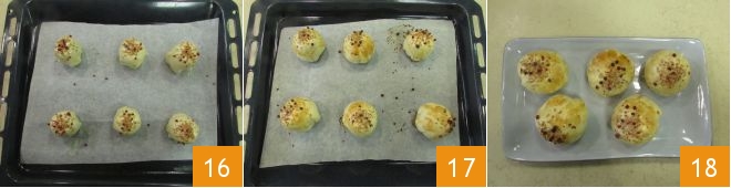 The apricots in puff pastry are ready for baking 16: bake in a preheated static oven at 392°F for 15-18 minutes on the middle rack until golden brown. Once ready, take the apricots out of the oven 17 and let them cool slightly before serving 18.