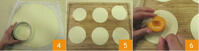 Using a pastry cutter with a diameter of 4 inches, cut out 6 circles from the puff pastry sheet (4-5). Place half an apricot in the center of the pastry with the round side facing down 6.
