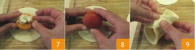 and fill the cavity with the scamorza cubes 7, then close with the other half of the apricot 8. At this point, wrap the pastry circle around the fruit, overlapping the edges 9.