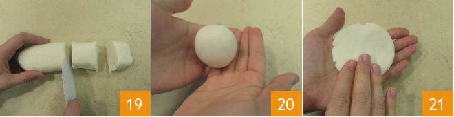 At this point, divide the dough into 8 portions of about 3.2 oz each 19 and form balls 20, then flatten them with the palm of your hand to a thickness of about 0.6 inches 21.
