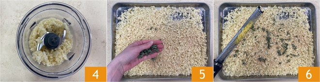 Put the bread crumbs in a mixer 4 and blend until reduced to crumbs. Spread the crumbs on a tray, then add half of the chopped sage 5 and the grated lemon zest 6.