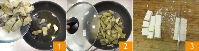 To make the artichoke and quartirolo triangles, start by preparing the filling: sauté 2 crushed garlic cloves in a non-stick pan with a drizzle of oil, then raise the heat and add the artichokes 1. Cover with a lid and cook over medium-high heat for about 10 minutes 2. In the meantime, cut the quartirolo into cubes of about 0.4 inches 3.