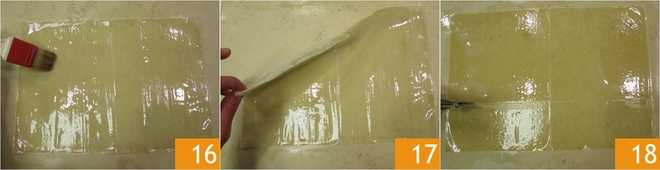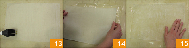 Brush the second sheet with oil as well 16, then flip the two sheets together 17 to brush the base too. You have completed the first piece made of two phyllo sheets: proceed in pairs like this for the others, to obtain 4 pieces in total. Using a pastry cutter, divide each of these double sheets into 3 strips of 2x12 inches, lengthwise 18: in total, you will have 12 rectangles.