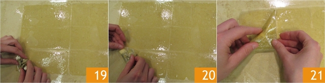 Add a scant tablespoon of filling to one corner of the first rectangle 19 and fold to form a triangle 20, then continue folding in this way until you reach the opposite end of the strip 21.