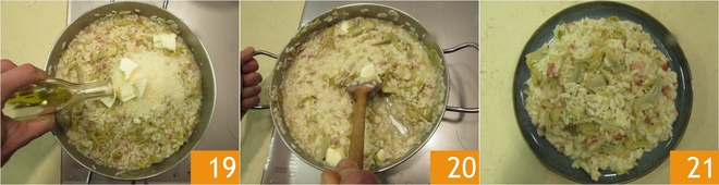 Add the artichokes to the risotto 16, which will have finished cooking, turn off the heat, and cream with grated cheese 17, butter 18