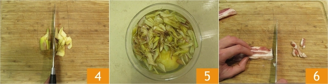 Cut the artichokes in half and remove the internal "choke," then slice them 4. Place the artichokes in the acidulated water so they won't darken 5. Cut the bacon into strips 6.