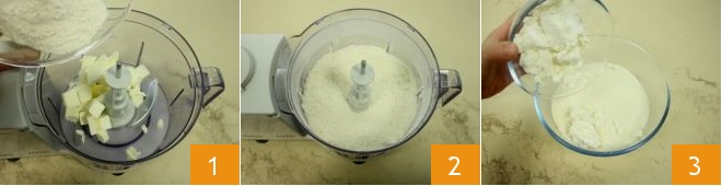 To prepare the artichoke mini tarts with a gooey center, start with the pastry: in a food processor place the cold butter cut into pieces, the sifted flour and a pinch of salt (add a pinch of pepper if you like) 1; pulse the processor to obtain a sandy texture 2, then transfer the mixture to a bowl and add the ricotta 3.