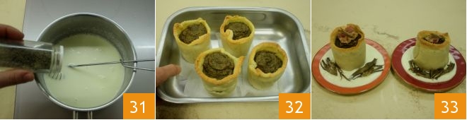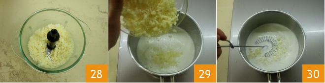 While the tarts bake, prepare the fonduta: finely chop the Montasio cheese in a food processor 28; in a small saucepan heat the milk over low heat and when it is just about to boil, remove from the heat and add the chopped Montasio 29, stirring with a whisk until it melts 30.