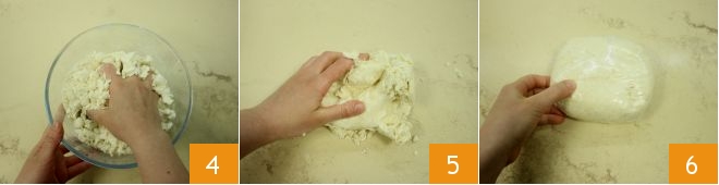 Quickly knead to combine the ingredients 4, transfer the dough to a work surface and handle it only long enough to make it smooth, homogeneous and compact 5. Shape into a disk, flatten it slightly and wrap it in plastic wrap 6. Refrigerate to firm up for at least 1 hour.