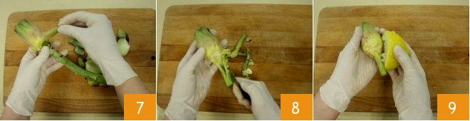 Meanwhile, prepare the filling: clean the artichokes (you can consult the cooking school sheet: How to clean artichokes), removing the outer leaves until you reach the lighter ones 7, then cut off almost all of the stem and remove the stringy part of the remainder with a vegetable peeler 8; rub the artichokes with half a lemon to prevent them from darkening 9.
