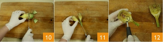 Then trim off the tips 10 and halve each artichoke heart 11; remove the choke with the tip of a knife 12.