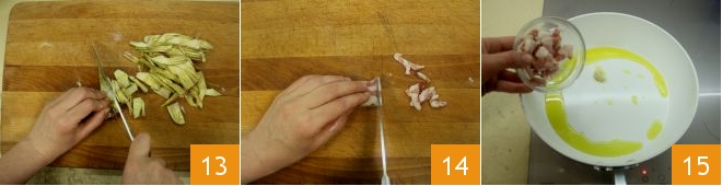 Slice them into julienne 13; place them in a bowl with acidulated water. Then cut the guanciale into small pieces 14, reserving 4 thin rectangles for the final decoration. Brown the guanciale pieces in a large skillet with a clove of garlic and a drizzle of olive oil 15.