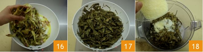 When browned, add the artichokes 16, season with salt and pepper to taste and stew them for at least 20 minutes, covered with a lid. Once tender 17, remove from the heat and transfer them to the bowl of a food processor; add the grated Pecorino 18.