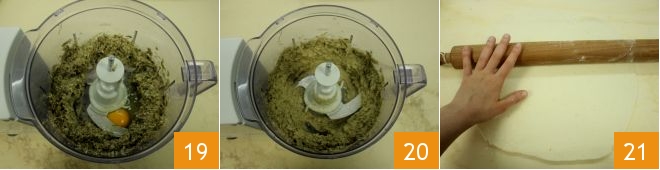 Pulse the blades to chop the ingredients, then add the egg 19 and process again until you obtain a smooth cream 20. Put the mixture into a piping bag; then take the pastry dough and roll it out into a thin sheet about 1/4 inch thick 21.