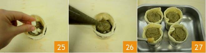 Put a little artichoke cream and a few small cubes of scamorza on the bottom 25, then fill further with the cream 26 up to the rim of the molds. Place the filled tart molds on a baking sheet and brush the edges with a beaten egg 27. Bake in a static (conventional) oven preheated to 356°F for 30 minutes (if using a fan (convection) oven, 320°F for 20–25 minutes).