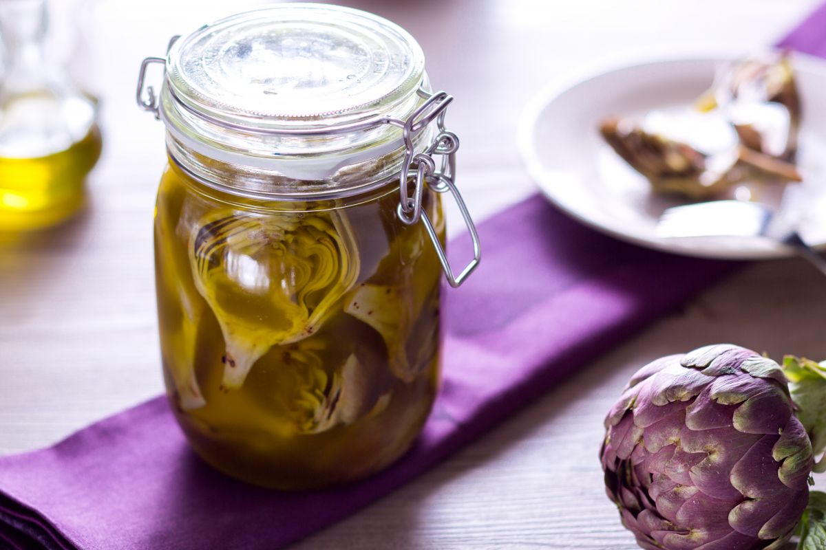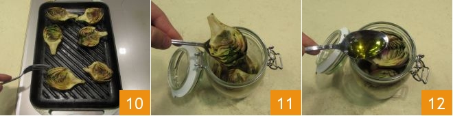 heat a grill and cook the artichokes for 3-4 minutes per side 10. Once cooked, transfer the artichokes into an airtight preserving jar 11, fill with olive oil until the artichokes are completely covered 12. For optimal preservation, it is recommended to fill the jar leaving 0.8 inches from the rim and to ensure the artichokes are well immersed in the liquid,