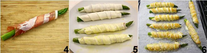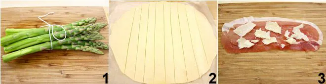To prepare the asparagus in puff pastry with prosciutto, start by cleaning the asparagus, removing the white parts of the stalks 1 and scraping them to remove the tougher outer layers (click here to see how). Gather them into a bundle tied with kitchen string and boil them in salted water for 8-10 minutes, until they are cooked but still crunchy. Drain the asparagus, let them cool and dry. Roll out the puff pastry, gently flatten it with a rolling pin, and cut out 8 strips of dough 2 about 1.18 inches wide. Lay out the prosciutto slices, sprinkle them with Parmesan flakes 3,