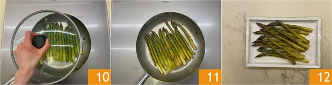 Cover with a lid 10 and slightly lower the heat. Cook for about 20 minutes until they are tender 11, then serve your sautéed asparagus 12!
