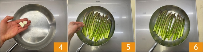 In a pan, add a pat of butter 4 and let it melt. Place the asparagus inside without overlapping them 5 and brown them over medium-high heat for 4-5 minutes 6.