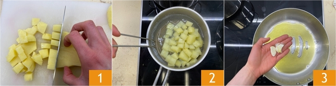 To prepare the asymmetric friarielli pizza, peel and cut the potatoes into cubes about 5\/8 in (1.5 cm) 1, then boil them for about 10 minutes; they should soften but not fall apart 2. In a pan heat a drizzle of oil with two cloves of garlic 3. Sauté over medium heat until the garlic is golden.