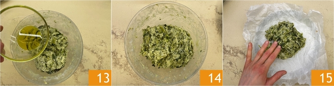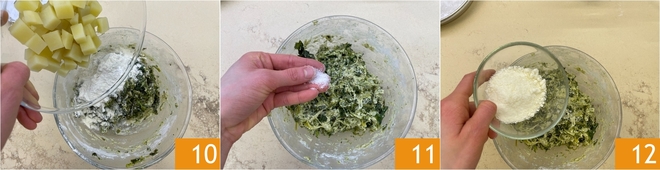 Also add the potatoes 10, mix without mashing them too much, then season with a pinch of salt 11 and grated pecorino 12.