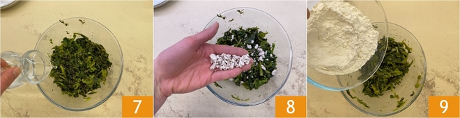 Transfer the friarielli to a bowl, then add the water 7, the crumbled yeast 8, stir to dissolve the yeast, then incorporate the flour 9.