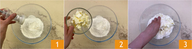 To prepare the autumn galette, start with the shortcrust pastry. In a bowl, place the flour, add the salt 1 and the cold butter 2. Work quickly, pinching it 3, until you get a mixture with the consistency of sand.