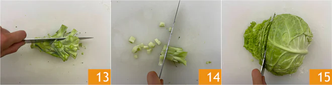 Remove the outer and harder part of the stem 13, cut it into cubes and add them to the florets 14. Remove the outer and tougher leaves of the savoy cabbage. Cut it in half and then into strips 15.