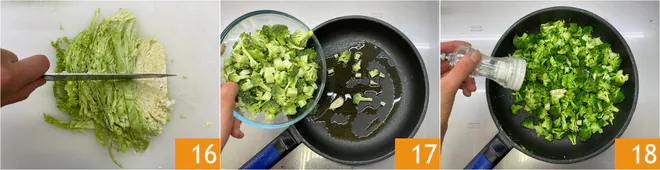 Cut the strips in half as well 16. In the same pan where you cooked the potatoes, pour a drizzle of oil, add a crushed garlic clove, then add the broccoli 17. Sauté for 5 minutes, adjust the salt 18.